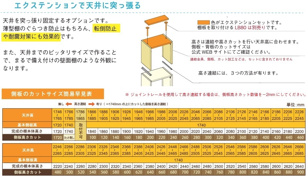 エクステンションセットは、棚の転倒防止や奥行きが浅く背の高い棚を作る場合のぐらつき防止等に効果的です。